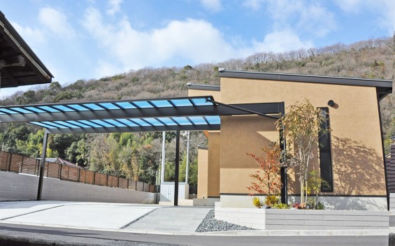 玄関の軒先から伸びるように設置されたカーポートもスタイリッシュなデザインを選び、お家との一体感を演出してあります。