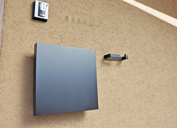 玄関口にある、おしゃれなスクエアポストと、傘などを立てられるマルチフックの取付けも、その一つです。