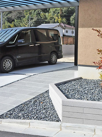 「本来ならブロックの交差したところは直角になるはずですが、ランドワークスさんからの提案を受けて、角を無くしてもらいました。車の出入りがとても楽になり、さすがプロだなと思いましたよ」とT様。「こういうところは素人では思いつかないからありがたい」と満足そうに微笑んでいらっしゃいました。