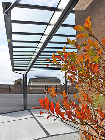 屋根のサイズは約8m×約6m。高さを上げた分、雨が入り込まないように広くしてあります。これにより、天気を気にせず、車の乗り降りや荷物運びを快適に行えるようになりました。