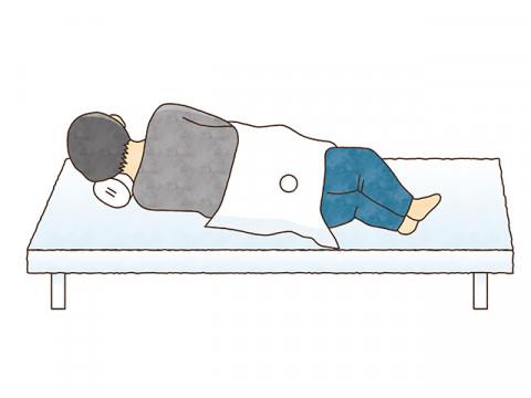 A. 痛みや腫れ、出血などの症状について尋ね(問診)、その後、なるべく恥ずかしさを感じないよう、横向きに寝てシーツをかけて(図)診察します。麻酔のゼリーを付けて指で診察し、痛みの部位や程度、シコリや出血の有無などを確認します(肛門・直腸指診)。次に、肛門鏡(便の太さ位)で、痔が腫れていないか、傷はないか、などを観察します。時間は、2、3分で終わります。