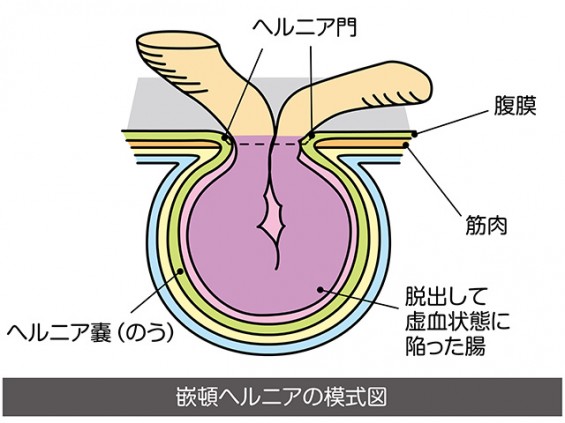 A. 嵌頓が起こるとヘルニアの膨らみが硬くなり、強い痛みや吐き気、嘔吐(おうと)を伴い、ヘルニア部分の皮膚が赤くなってきます。