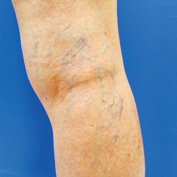 A. 網目状静脈瘤は、皮下の浅いところにある、経2〜3㎜の細い静脈(皮下静脈)が拡張した静脈瘤です。網の目のような形状を示すことからこのように呼ばれます。膝の裏側などにできやすく、血管が青く、網の目のように浮き上がってみえます。若い人でもよく見ると、この静脈瘤がみられることがあります。細くて症状がなくても、美容的な目的で受診する方が少なくありません。網目状静脈瘤は、くもの巣状静脈瘤などと交通することが多くあります。