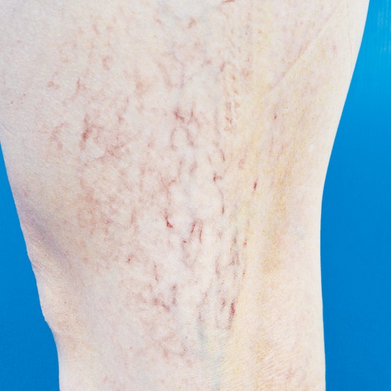 A. くもの巣状静脈瘤は、皮膚に近い(真皮内)ところを走る経1.0㎜以下のごく細い静脈が拡張した静脈瘤で、他の種類の静脈瘤と混在していることもあります。通常は、赤紫色の血管がくもの巣のように放射状に浮き上がってくることからこのように呼ばれます。治療が可能ですが、美容的な意味合いが強く、放置されることもあります。