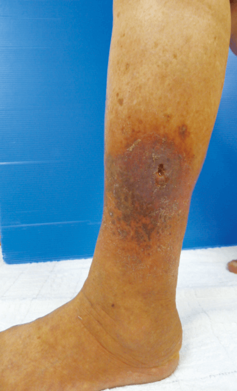 下肢静脈瘤が進行すると、血液循環が悪くなって皮膚組織が栄養障害を起こし、皮膚が薄く弱くなります。その結果、ちょっとした打ち身やひっかき傷がもとで、傷が広がり、しかもなかなか治らずに皮膚が欠損した状態(皮膚潰瘍)を生じるようになります。潰瘍は、下肢静脈瘤の最終段階で最も重症な合併症の一つです。