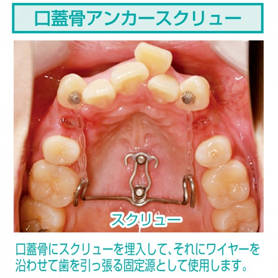 スピーディで確実な治療結果が期待できる、最新鋭の口蓋骨アンカースクリューを矯正治療に導入しました。一見、痛そうですが、痛みはほとんどありませんのでご安心ください。