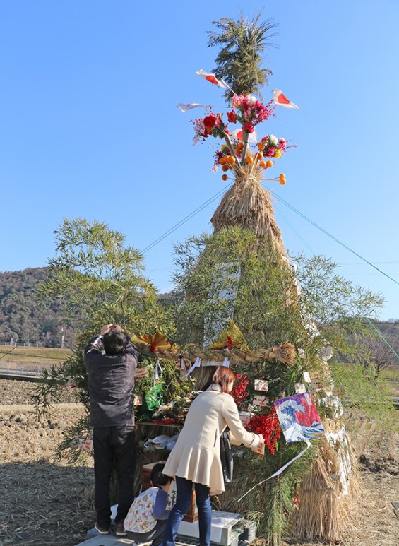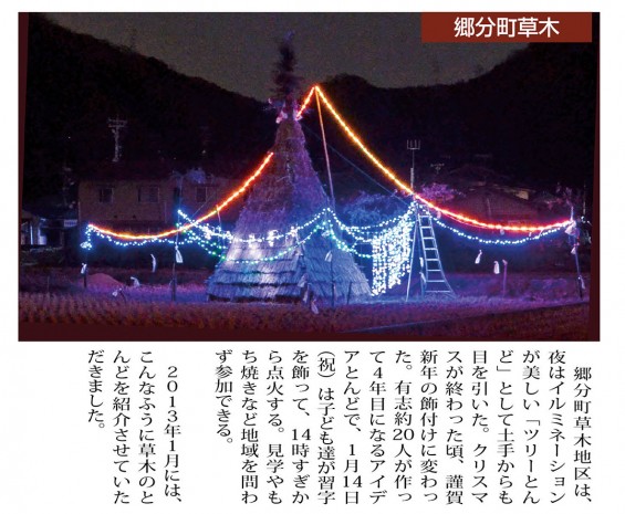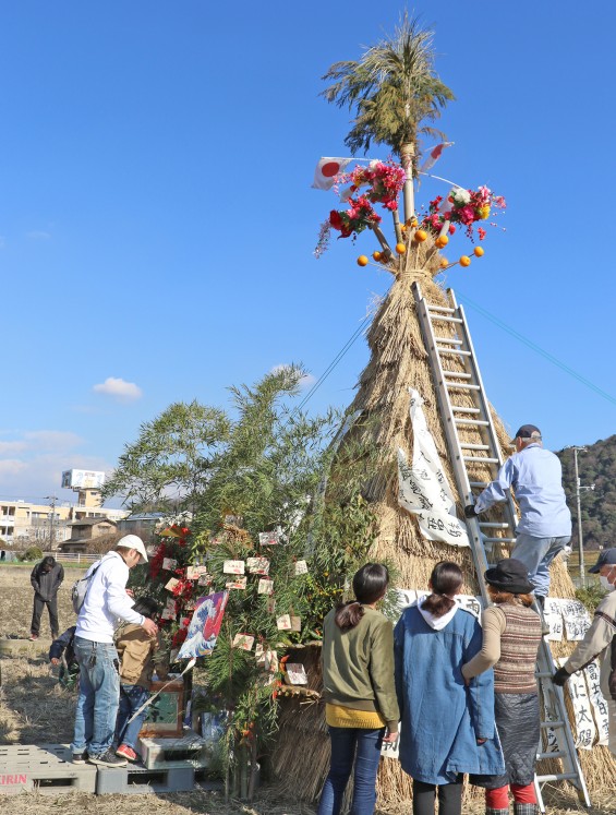 12月にはイルミネーションが輝き、年明けに花やミカンで鮮やかにお色直しし、とんど焼き当日は、さらに神棚を置き、周囲にぐるりと書を飾り付ける…。華やかなイメージチェンジをする郷分町草木のとんど14日、行事が行われました。