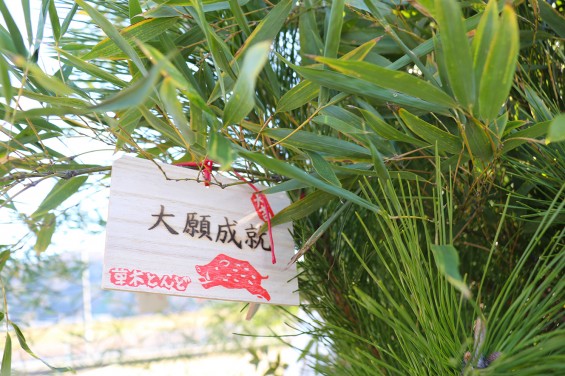「大願成就」の焼き印に、「草木とんど」と干支の「イノシシ」は、消しゴムはんこによる手作り。