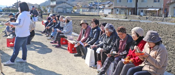準備ができたら、福山文化財協会でも活躍された、地元の佐道弘之さんの作詞による「草木地区版とんど音頭」を歌いました。歌唱指導も佐道さんです。