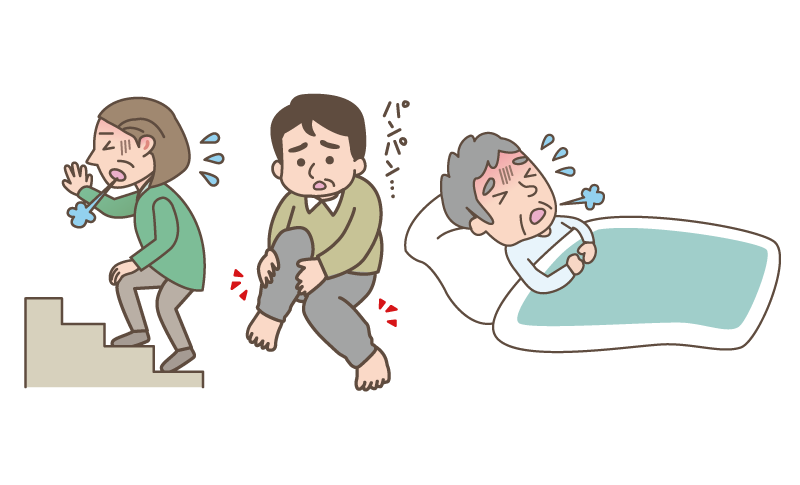 他に浮腫という足のむくみも症状の一つとして表れてきます。目安として、階段や坂道を上がった時に動悸や息切れがする場合は、心不全の可能性があります。