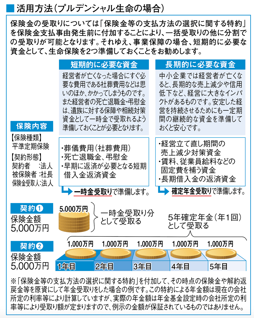A. そうですね。受取り方を工夫することで、ある程度の対策は可能です。経営者が亡くなって受取る保険金は社葬費用や短期借入金の返済など、短期の事業保障目的としている場合が多いものです。しかしながら中小企業においては長期的な売り上げ低下や、しばらくの間の固定費も重要な保障の範囲であり、これらを目的通りに受取ることができれば良いわけです。このようなことを考慮して、