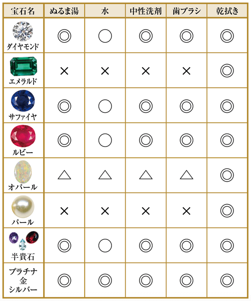 宝石にはそれぞれ特性があり、取り扱いについても差があります。表で記したクリーニング方法と注意点を参考にして、大切なジュエリーを末永くご愛用ください。