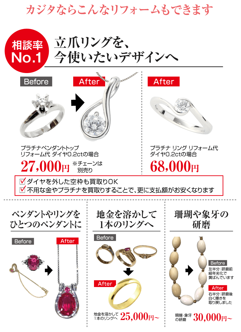カジタではリフォームの際、不用な貴金属や壊れてしまったジュエリーの地金を利用してリフォームの材料にしたり、現金買取を行なっています。