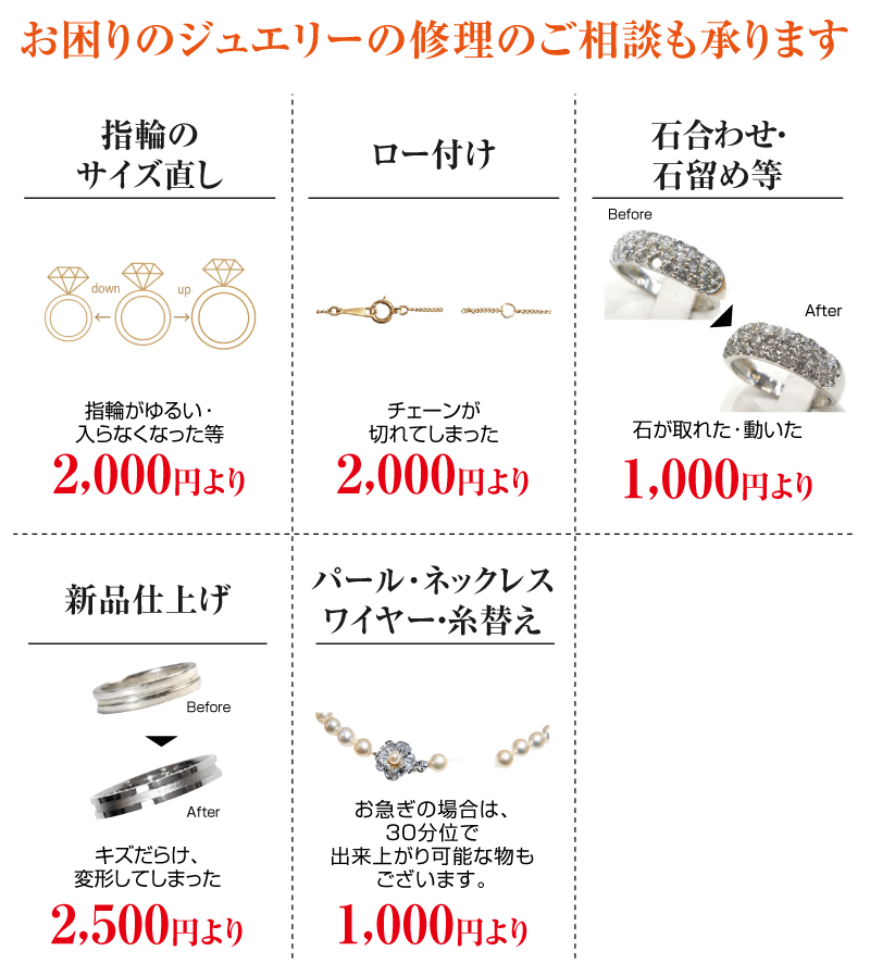 高いイメージを持たれがちなジュエリーのリフォームですが、不用な貴金属を下取りに出すことでリーズナブルにリフォームが可能です。ジュエリーのリフォーム・修理は他店購入品やブランド品でも対応いたします。ジュエリーの下取りについても、お気軽に店頭にてご相談ください。