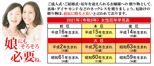 最近では厄除けに真珠を買われる方が増えています。厄年は人生の節目で、災いが起きやすい時期です。昔から「長いもの」「七色のもの」を身につけると良いとされてきました。昔は着物の帯でしたが、近年は着物を着る機会があまりないため、「長く」「七色の光」のテリのある真珠のネックレスを贈られると喜ばれます。