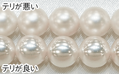 テリとは真珠独特の輝きのことで、真珠というジュエリーの最大の魅力がこのテリです。テリの良い悪いは比較してみれば一目瞭然です。テリの良い真珠は、お顔を明るく見せてくれます。離れたところからでも、並べて比べてみると分かるので、とても重要です。