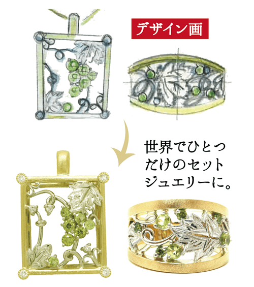 昔自分で購入した品や、形見の品を、世界にたった一つしかないデザインへ、アレンジすることができます。