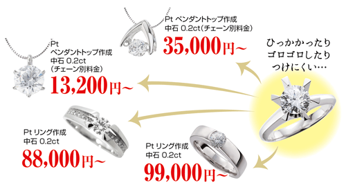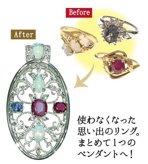 指輪の腕をカットしてペンダントへ加工するなど、お手軽にご希望の使いたいジュエリーへお直しすると、気分も新たに身につけることができます。