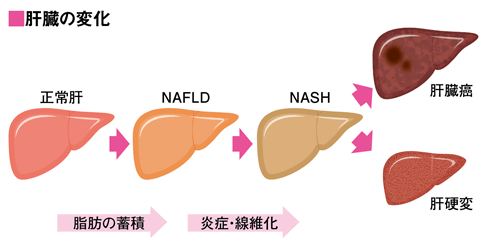 一般的に、脂肪肝は、良性疾患である単純性脂肪肝(NAFLD:ナッフルディー)と、炎症や線維化を伴い肝硬変や肝癌に進展する非アルコール性脂肪肝炎(NASH:ナッシュ)の2つがあります。