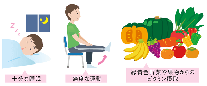 この細胞性免疫を高めるには、①緑黄色野菜や果物からのビタミン摂取(南瓜や果物の過剰摂取は血糖を悪化させるので、適正量に留めましょう)、②適度な運動、③十分な睡眠が不可欠です。
