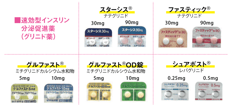 『速効型インスリン分泌促進薬(グリニド薬)』は、2型糖尿病患者さんの食後のインスリン分泌の立ち上がりを正常化することで、食後高血糖やグルコーススパイクを改善します。24時間持続的にインスリン分泌を促進させるSU薬と違って、速効型インスリン分泌促進薬は、内服後3時間程度しか作用が持続しないため、次の食事の時間(空腹時)には、効果が切れます。ですので、低血糖の心配がそれほど要りません。