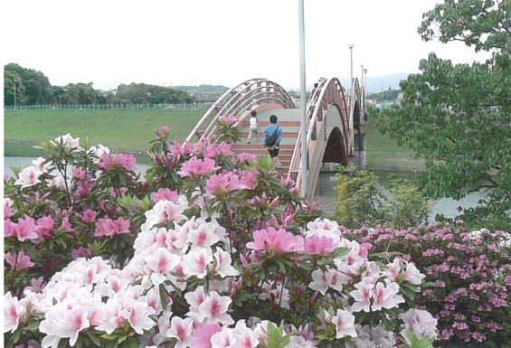 朱塗りの「浦島橋」や、世羅町出身の彫刻家・杭谷一東さんが手掛けた大理石の巨大なモニュメント「太陽の滴」をはじめ、桜並木が続く「桜の丘」、63種3000本のバラを鑑賞できる「花の広場」160種50000株のショウブが咲き誇る「しょうぶ園」など、園内はフォトスポットの宝庫です。たくさんの人が四季折々の景色とともに遠足やピクニックなどを楽しんでいます。