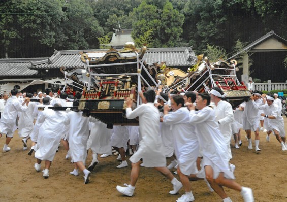 今年は土井・浜、中村・西、鍛冶屋、山之神の御輿4体が集まって、「ヨイ、ヨイ、ヨイサ」の掛け声とともに競り合いました。重さ400kgを超える御輿がうねる様は実に勇壮で、担ぎ手も観る側も興奮のるつぼに包まれます。