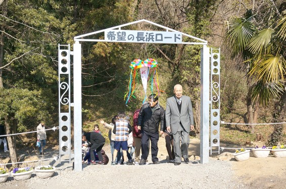 最後は、製鉄技術のある地域の人のおかげで立派なアーチも完成。名前は公募し、小学生が名付けた ものです。このとき記念に植樹した桜の苗木は、まだ幼いながらも花を咲かせるようになりました。この長浜ロードを、地域防災のシンボルとしても、健康のための遊歩道としても、皆で維持管理していきたいです。