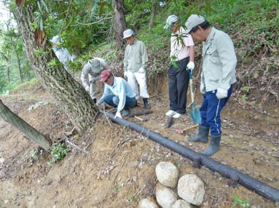 地域の大半が海抜0mという我が学区において、高台にある小学校は最高の避難場所。東日本大震災で津波災害の恐ろしさを知った私たちは、校舎南側の通学路とは別に、もう一つ避難路を確保するこ とにしたのです。当時、ジャングルだった山に分け入り、延べ250人で2年がかりで遊歩道をつくりました。