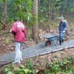 “プラ擬木”を使って道の脇を整えたあとは、一輪車で何往復もしながら砂利を運んでいきました。