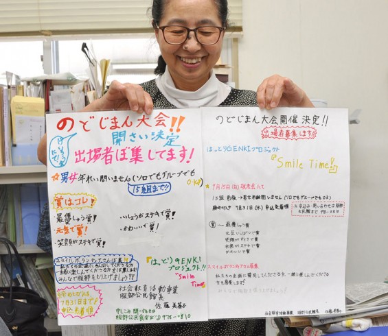 服部のPR動画をつくる、プロレス大会をする、ミニ体育祭をする…。ブレスト会議で書き出したアイディアのなかから数点を選び、自分たちで実現しようと張り切っています。目下、協議しているのは9月の敬老会で開催する「のどじまん大会」について。誰でも参加できて、みんなで楽しめる大会にしようと、一生懸命企画しています。入賞賞品も用意して、屋台も準備するみたいですよ!さっそく、参加を呼びかけるポップもたくさん手作りしていました。近日中に学区内に貼り出される予定です。