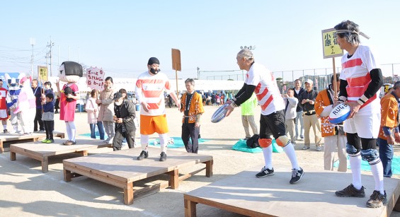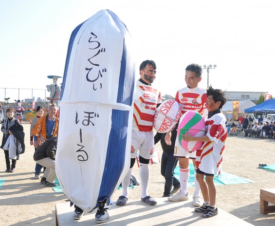 ラグビー、東京五輪、即位礼正殿の儀…と、一目で2019年を振り返ることができるユニークなかかしがグラウンドに登場しました。