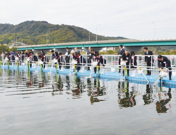 式典で演奏を披露した水呑小学校琴クラブ8人と出席者が、祝賀行事として、20mの浮き桟橋から芦田川へフナ50㎏とウナギ20㎏の稚魚放流を行なった。
