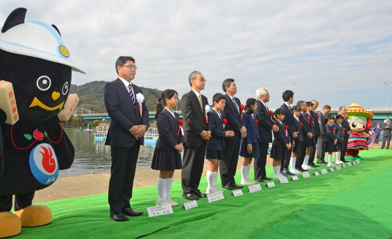 式典で塚原浩一 水管理・国土保全局長は「全国191ヶ所の水辺を活用する取り組みのひとつ。水防災、水意識社会にもつながる」。枝廣市長は「川と街がつながり、憩いと活気が融合する」と期待を込めた。