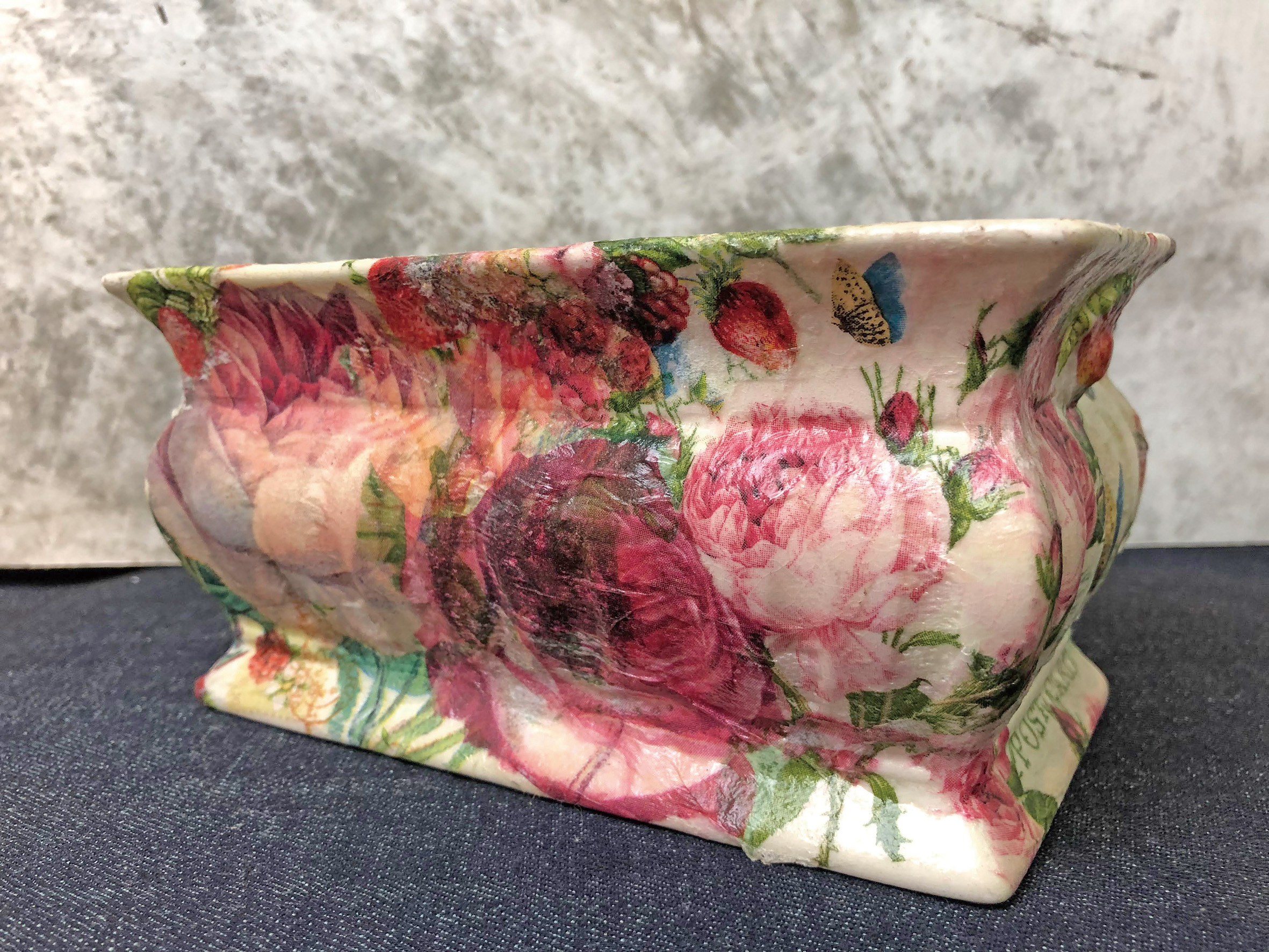 ここまで聞くと、現代でもすごい伝統工芸品を作るかと思われますが、画像検索すると、子どもの上履きや石鹸を加工したものが出てきます。身近な物に専用の糊でペーパーナプキンの好きな柄を切り取って貼り付けています。フラワーデザインでは、お花を入れる器や観葉植物の鉢カバーとして作って楽しむことができます。