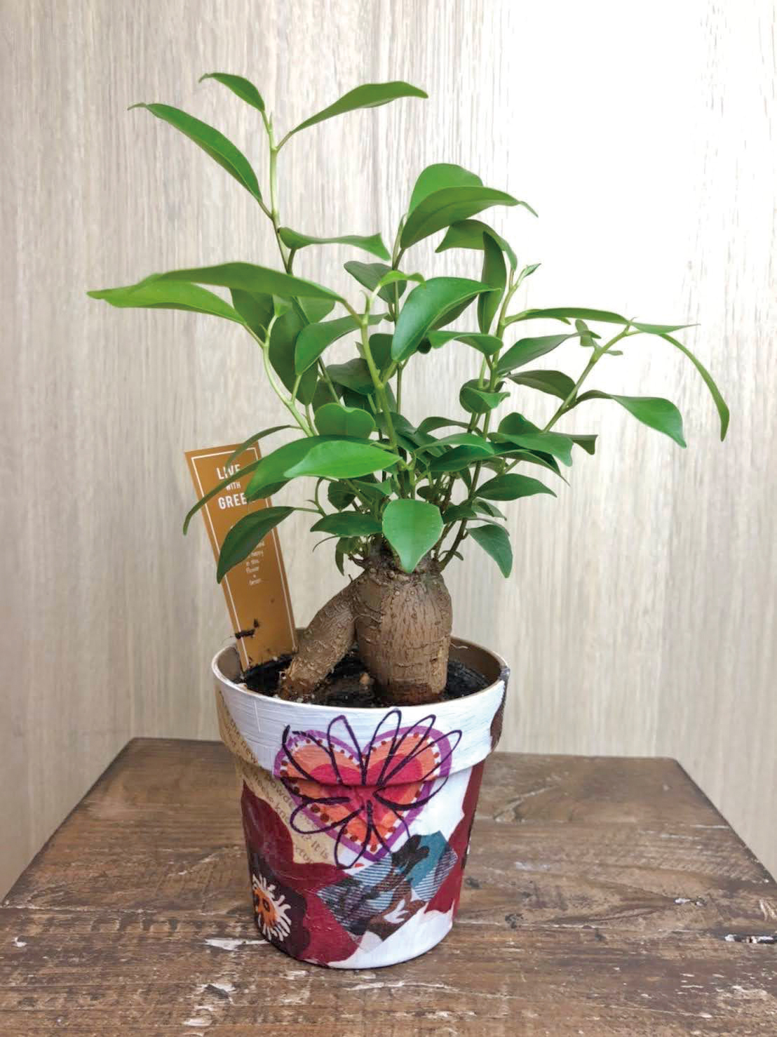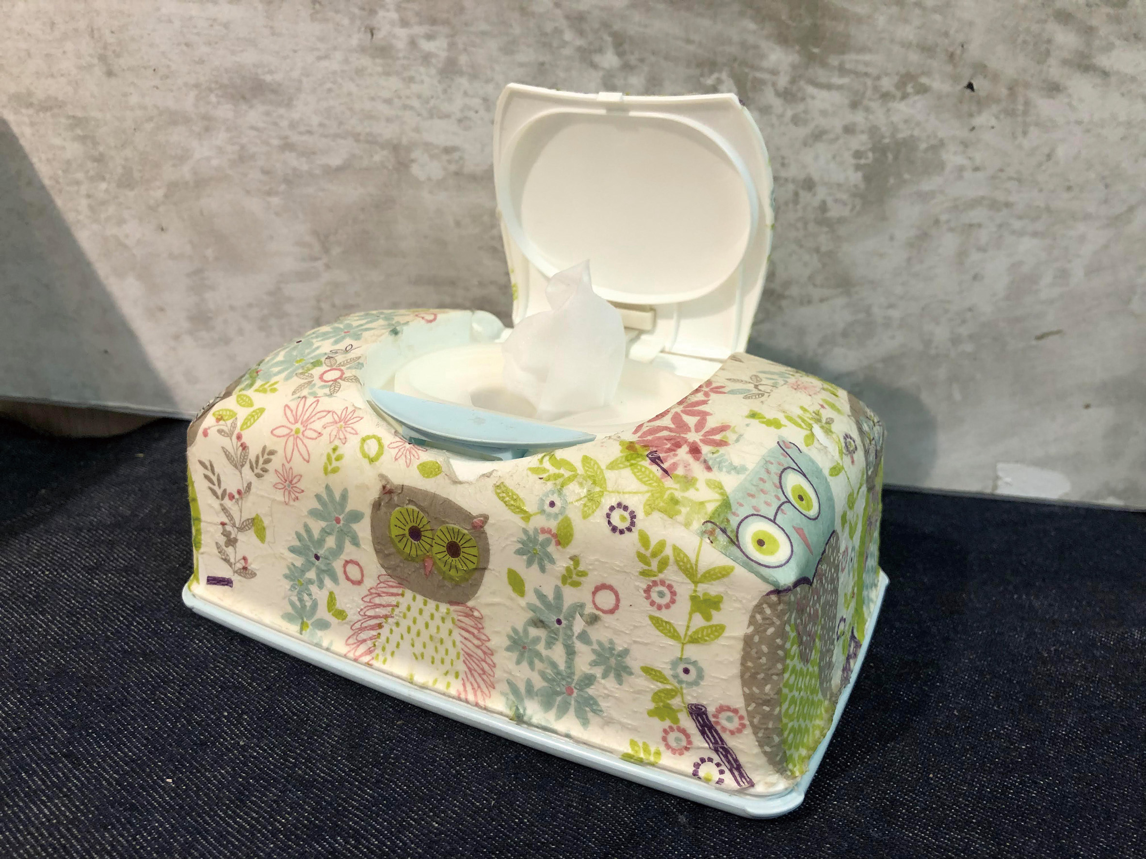ガジュマルの鉢カバーとウェットティッシュケース。基本的に白い物なら貼って作ることができます。