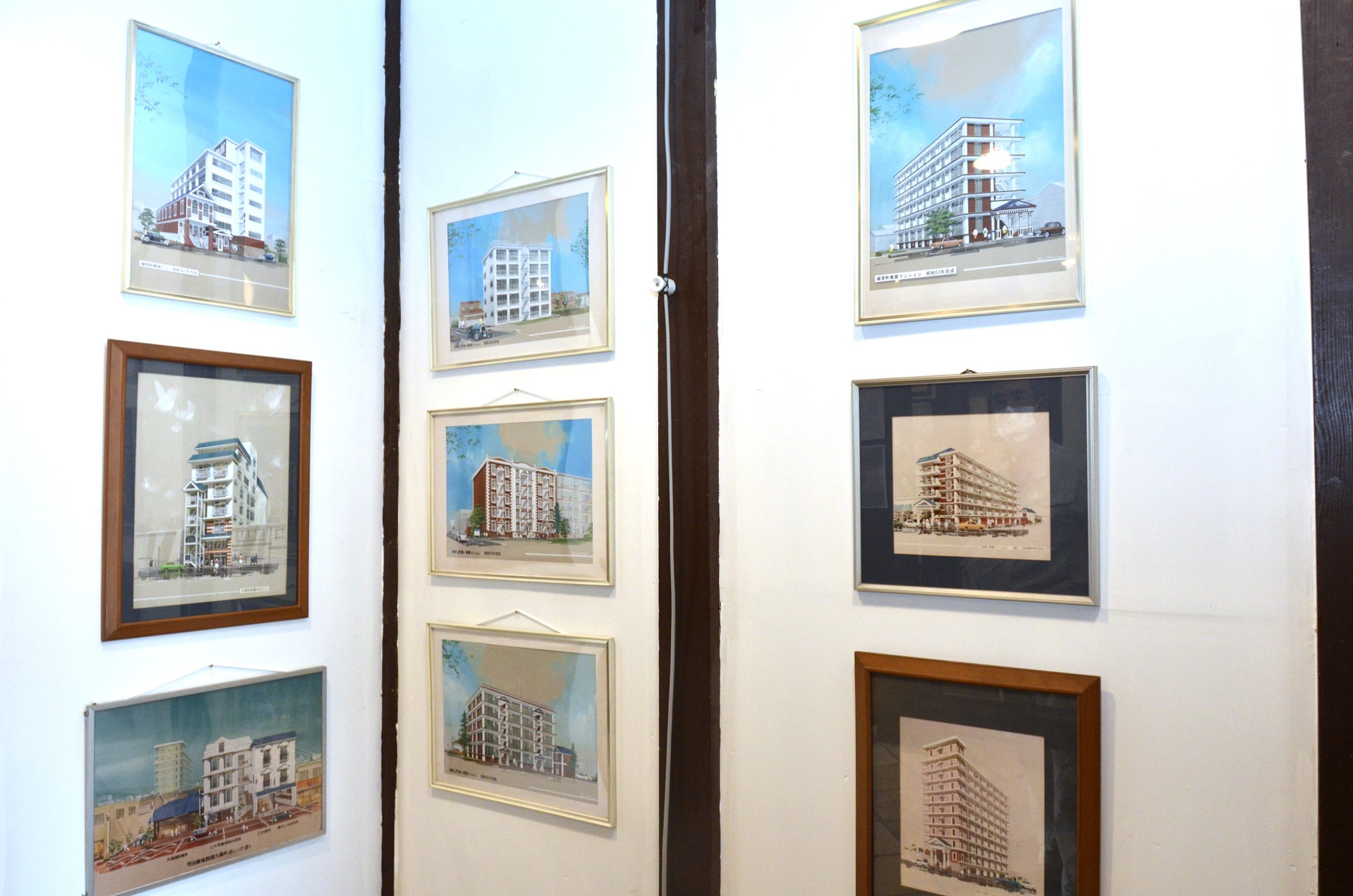 能宗館長が社長を務める菊屋マンションは昭和42年から現在まで市内に11棟(630世帯)。これらパース図も展示され、コンセプトや外観の統一感を持って建築されてきたことがわかる。