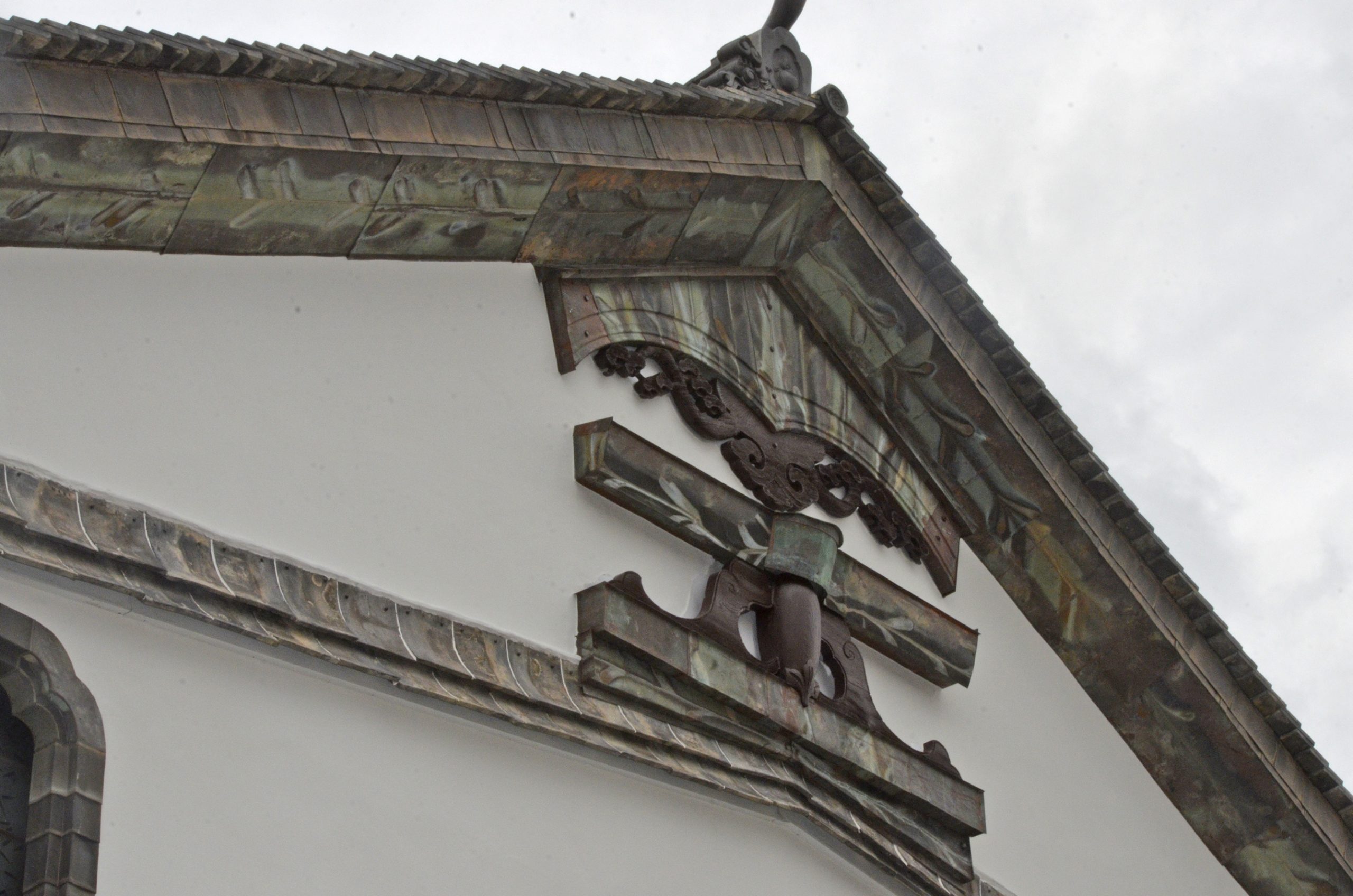 ただ、そのまま移築したのではなく、隣家と接していた西側壁には蟇股(かえるまた)や懸魚(げぎょ)を装飾的に施し、窓に瓦のふちどりをし、腰より下壁面の瓦も表と裏を交互に使うなどデザイン的に造り上げられている。