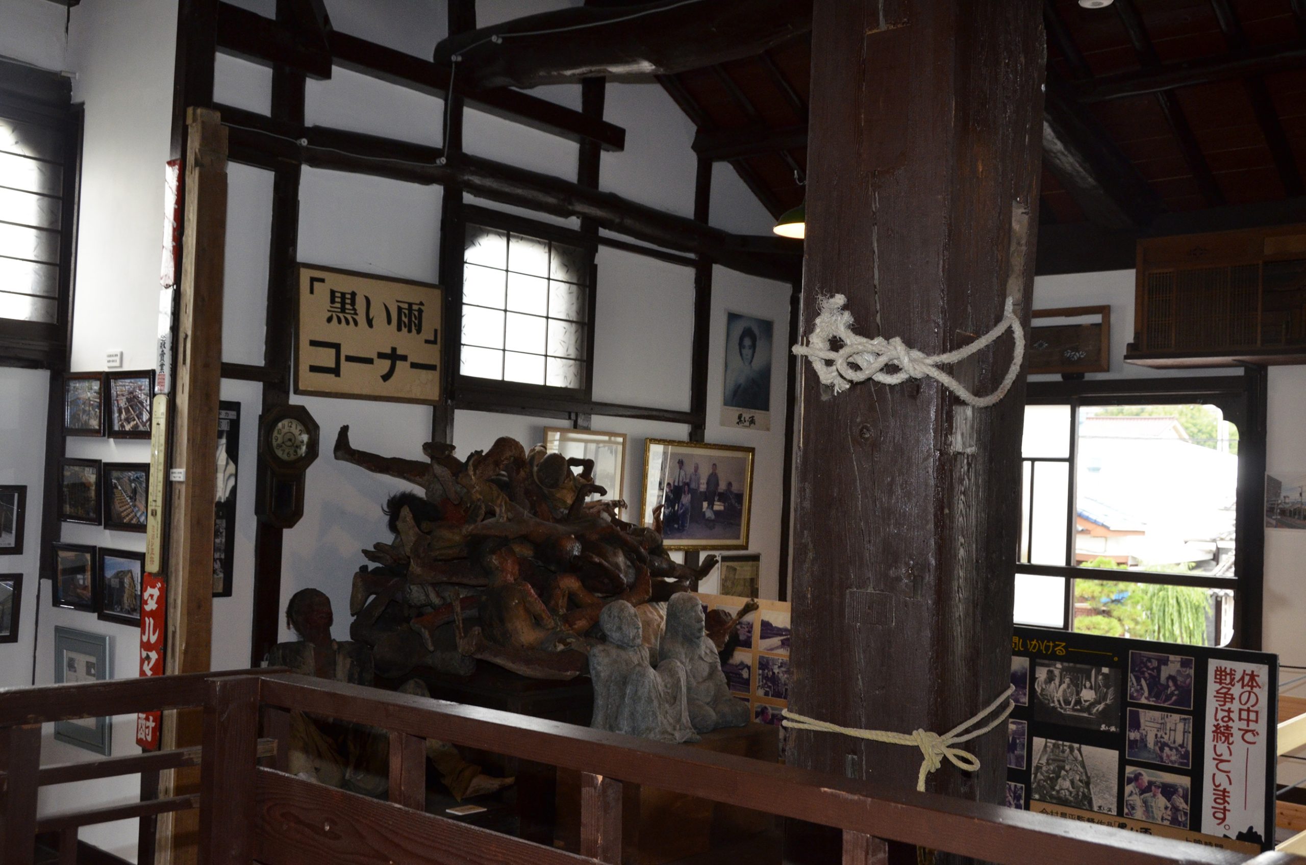 10年あまり封印していた映画「黒い雨」コーナーを2階へ。博物館ができる前年に撮影に協力。撮影に使われ譲り受けた被爆再現人形を荼毘にふすかのように積み重ねた一角も作った。