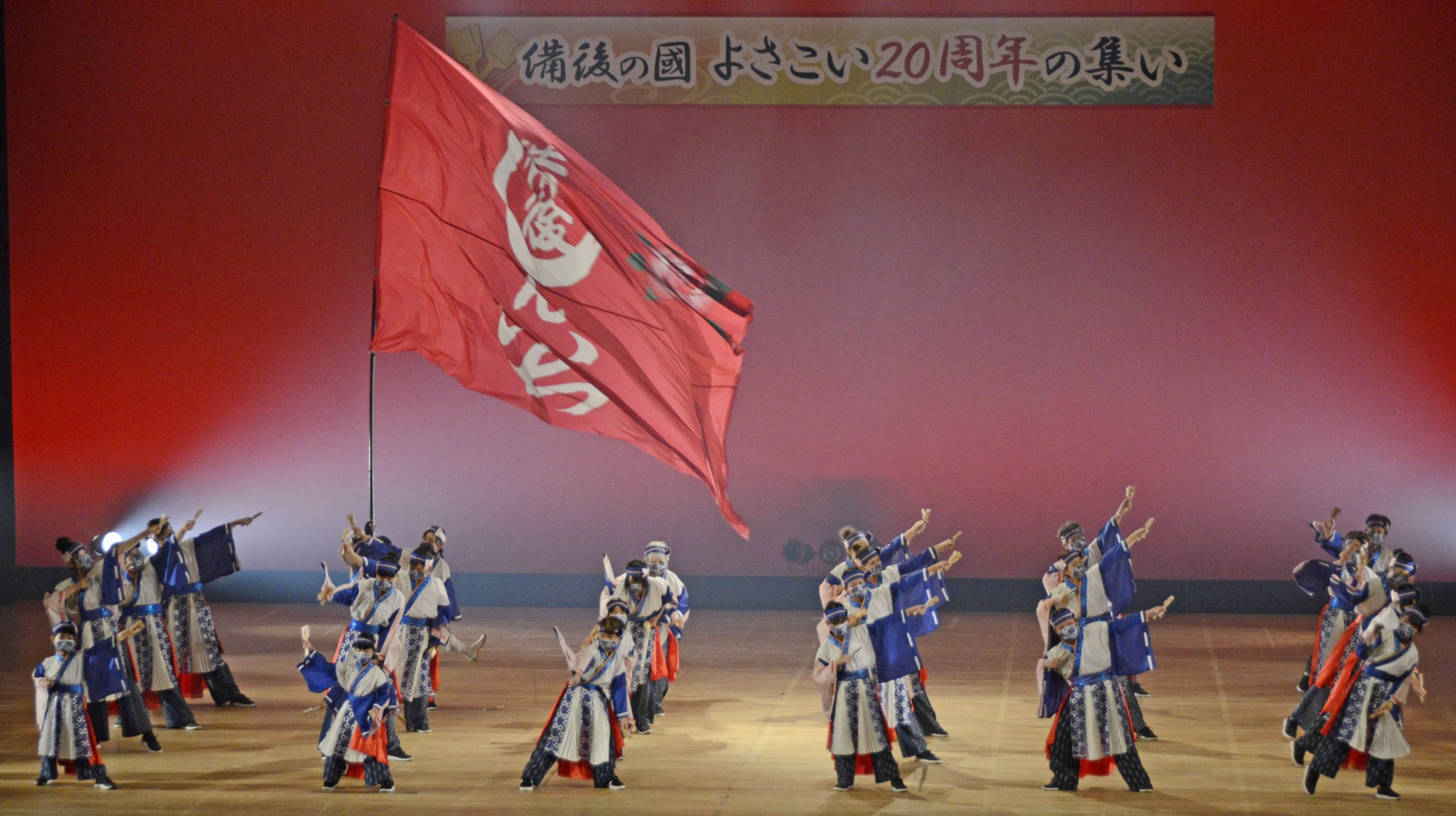 「備後の國よさこい20周年の集い」が18日、リーデンローズで開かれ、満席となる約2千人の観客とともに祝い盛り上がった。
