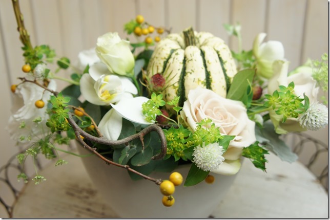 白いカボチャと都忘れ・スノーボール・ワイヤープランツ・ダスティーミラー