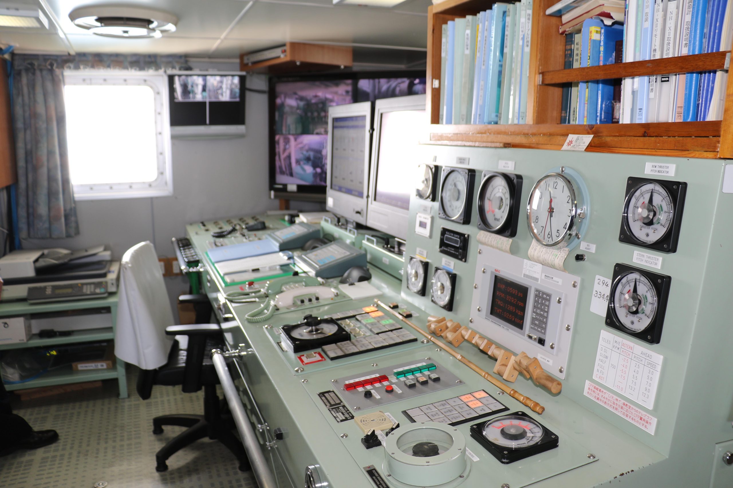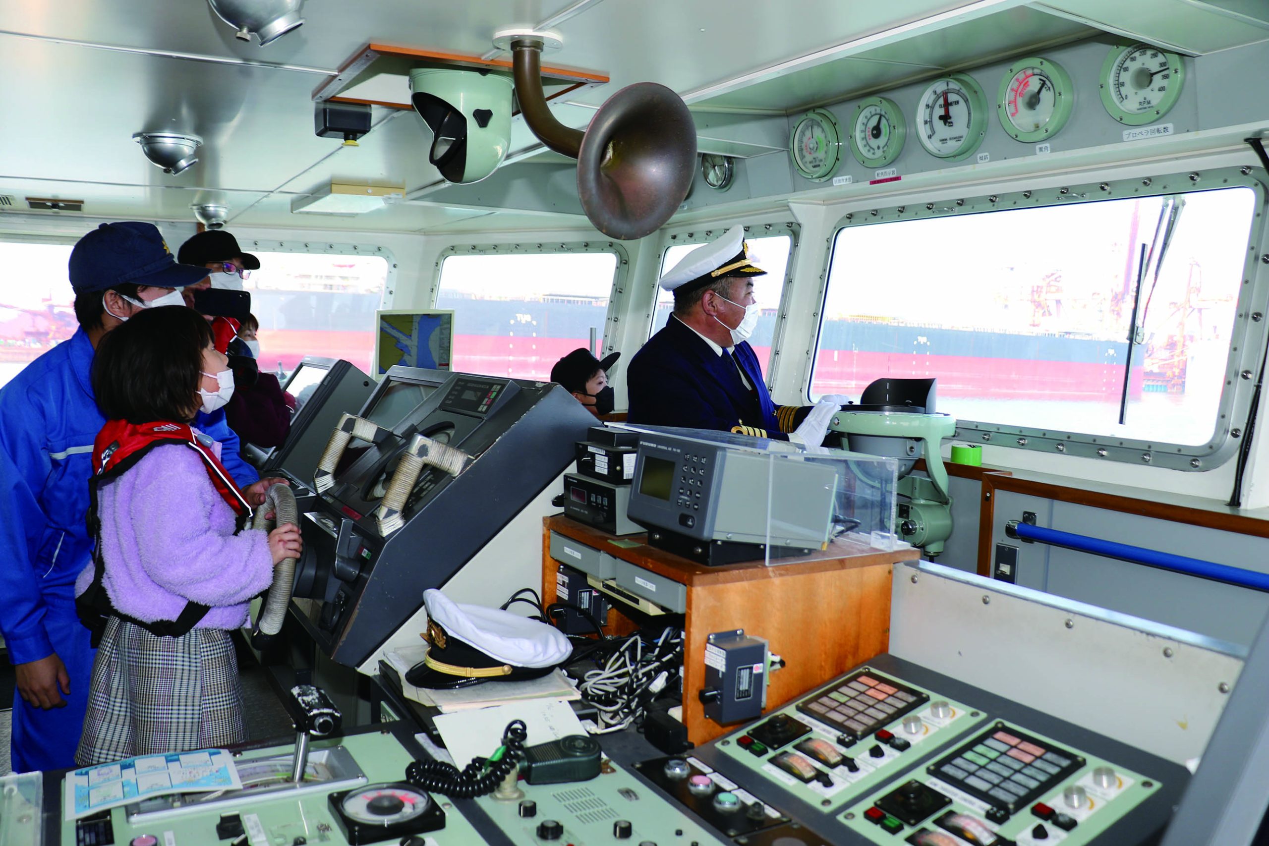 船内の最上階に位置する「ブリッジ(船橋)」には、航海計器や警報類、海図などがが集中装備され、このブリッジで子どもたちは、船長の指示にあわせて舵を切った。