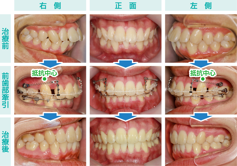 小臼歯抜歯を伴う矯正治療を成功に導くポイントの一つが、前歯部の牽引法です。