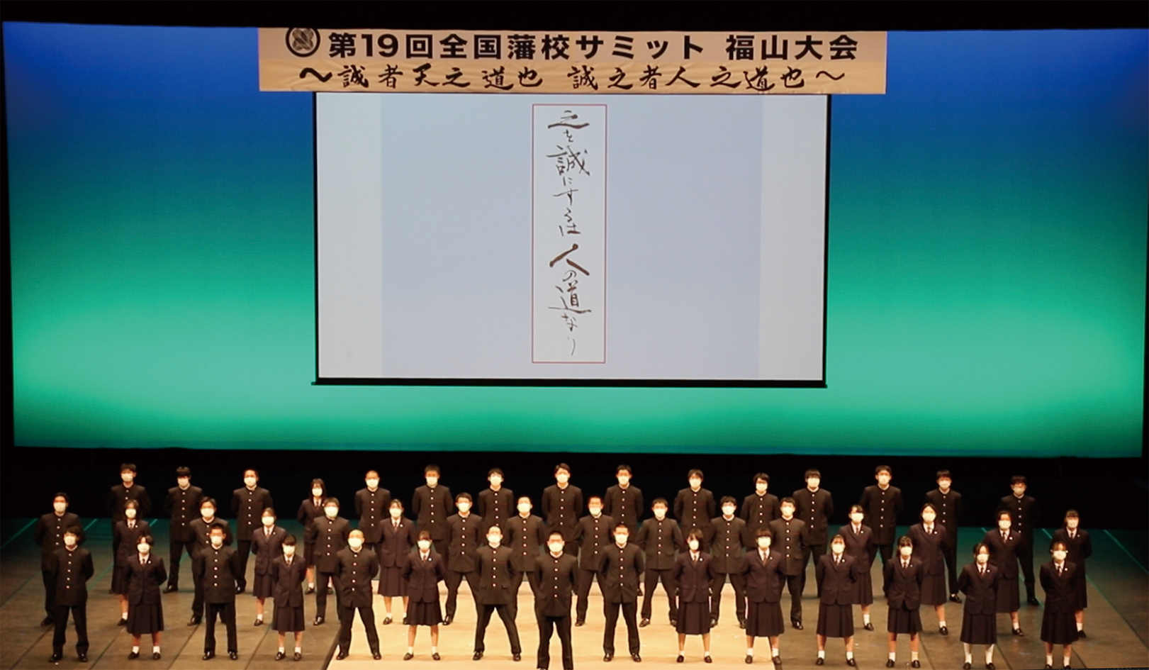 福山誠之館高校の約50人がステージに上がり、校名の元となった「中庸」(四書のひとつ)を朗々と素読した。
