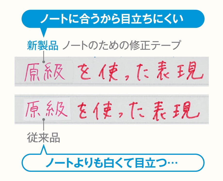 修正テープの色がノートの色と同じで、A罫とB罫にぴったりの幅(罫幅より0・5㎜狭い)なので、修正した場所が目立ちにくく、ノートの幅を超えて消してしまったり二重に消したりする必要がなくなります。