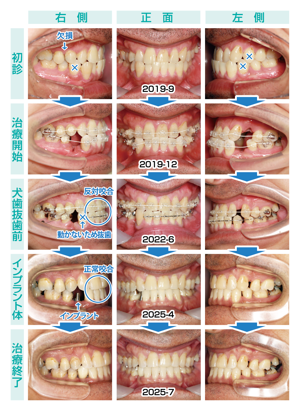 40代の男性の患者さんは「受け口(反対咬合)」を治したいと来院されました。右上の小臼歯(4番)がなくなっていることで、左右のバランスが崩れ、今の噛み合わせになったと考えられます。そこでバランスをよくするため、他の小臼歯を3本抜歯してスペースを利用して、前歯の噛み合わせを整えながら反対咬合を改善していく治療を始めました。しかし、途中で右下の犬歯(3番)だけが全く動かなくなってしまったのです。さまざまな方法を試しましたが、歯は動かず、さらに詳しく調べてみると、動かしたい部位の骨がしっかり残っていなかったことが原因でした。最終的にはその犬歯を抜歯する事で歯並びはきれいに整い、抜歯部位をインプラントに置き換えることで、治療を無事に終えることができました。