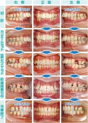 そこで治療方針を変更し、上顎第一小臼歯の抜歯を選択。臼歯関係はフルクラスⅡのまま残し、前歯の位置をコントロールしながら理想的な咬合を目指しました。