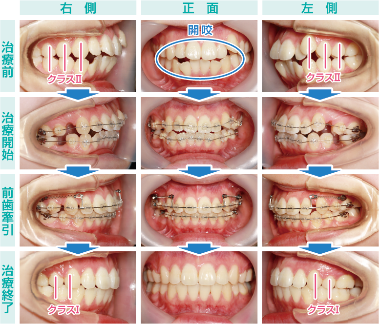 本症例では、下顎5番の抜歯によりクラスIへの是正を容易にし、臼歯関係を確立した段階で前歯を舌側方向へ牽引しました。抜歯スペースを利用して前歯を後方へ移動させると、自然な力の方向により開咬が改善し、適切な被蓋が得られます。