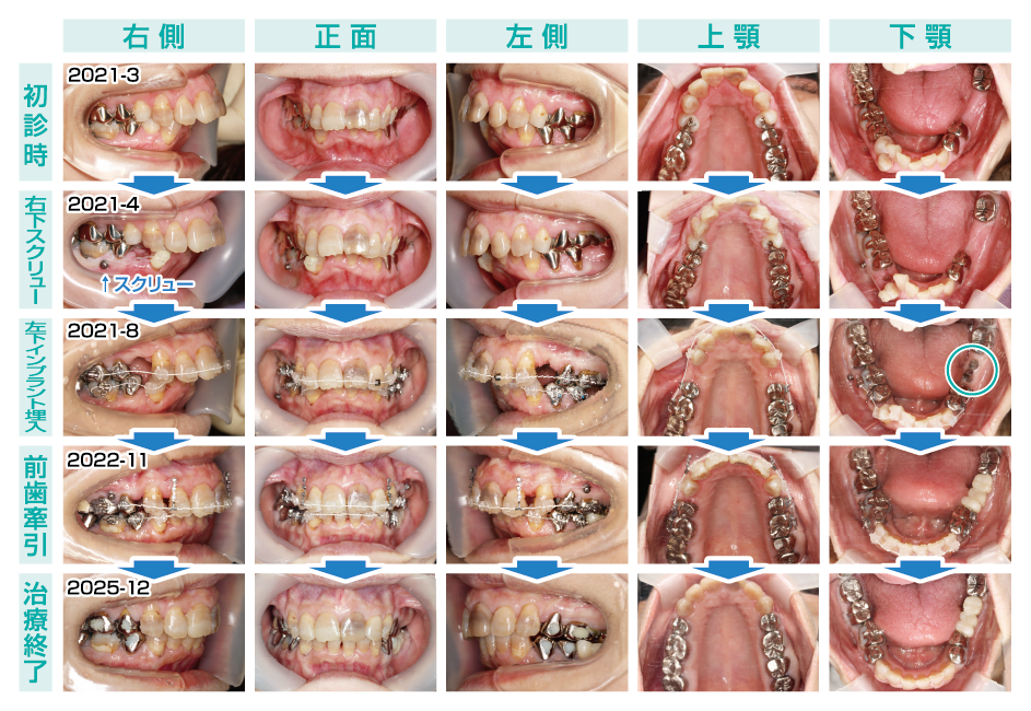 治療中、歯を動かすための土台となる奥歯が不足していたため、デンタルインプラントを埋入し、安定した咬合と矯正環境を整えました。特に前歯の突出は非常に強く、見た目だけでなく噛み合わせにも大きく影響していたため、慎重かつ確実な歯の移動が必要でした。