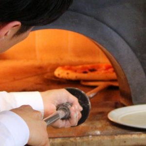 注文が入ってから生地を成形し、石窯で焼き上げるピッツァ。モチモチとした食感と香ばしい香りが食欲をそそる。トマトとモッツァレラチーズ、バジルで作るシンプルなマルゲリータや、卵をのせたビスマルクなどの定番や季節限定のメニューなど約15種類がラインナップ。
